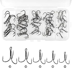 HXC 45Stück Drillingshaken Set Stark Drillingshaken mit Kunststoffbox Dreifachhaken Angelhaken Schwarz Nickel Stark…