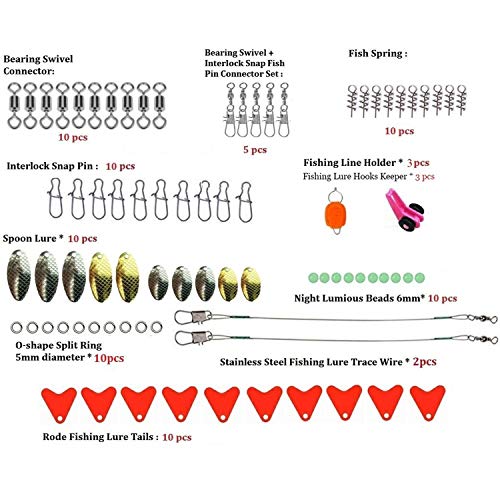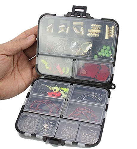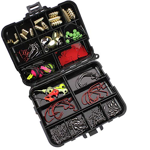 Paket einschließlich: Bullet Sinker * 14; Drillinge * 10; O-Form-Spaltring * 10; Löffel Köder * 10; Nacht Lumious Beads * 10; Fischköder Trace Wire * 2; Fischköder Haken Keeper * 3; Angelschnur Halter (zufällige Farbe) * 2; Angelköder Tails * 10; Jigkopf Fishhook 3.5g * 5; Verriegelungsbolzen * 1; Kugellager Swivel + Interlock Snap Pin Angeln Stecker Set * 5; Angeln Frühling * 10; Kugellagerdrehverbinder * 10; abgesetzter Haken * 15 Kunststoff Angelgerät Box * 1.