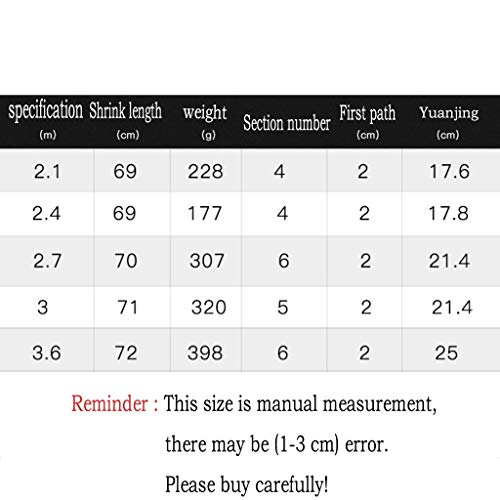 4. Größe Optionen: Es gibt 5 Größenoptionen für Angelruten.Die detaillierte Größe auf dem Ebenbild zu sehen.(Die Angelrute zusammengezogen und in der Länge verändert werden kann, sehr geeignet für Freunde, die wie Angeln)