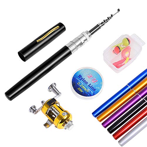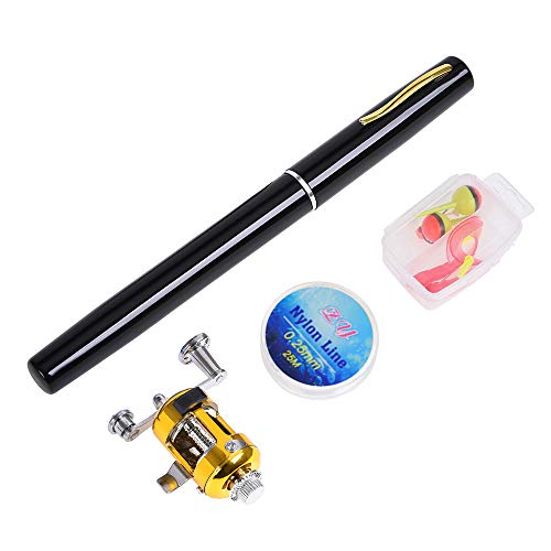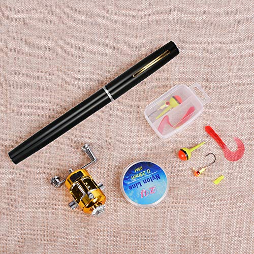 Komplettpaket: 1 * Pen-Rute, 1 * Rolle, 1 * 25 m Schnur, 1 * Mami mit Angelzubehör, die 2 * Schwimmer, 2 * Jig-Haken, 2 * weiche Köder, 2 * Gummischläuche enthält.