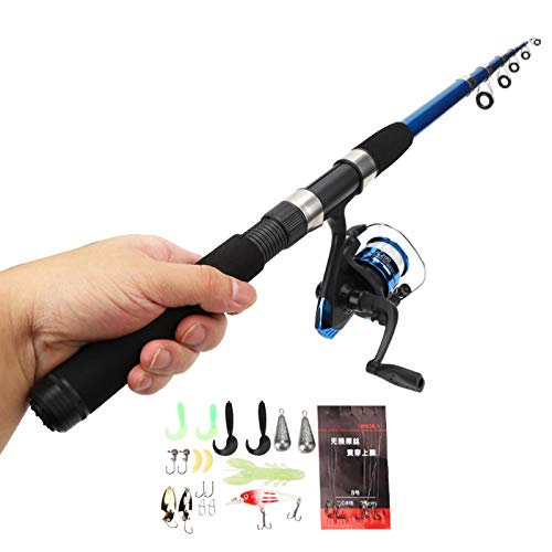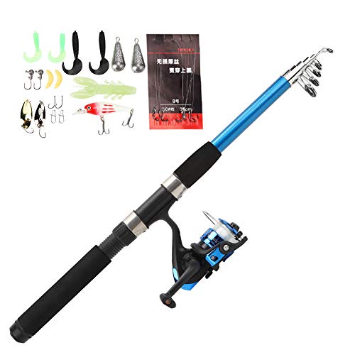 Das Angelset enthält 1 Angelrute, 1 Angelrolle, verschiedene Angelköder, Angelhaken, 100 m Angelschnur und einige Angelhaken.