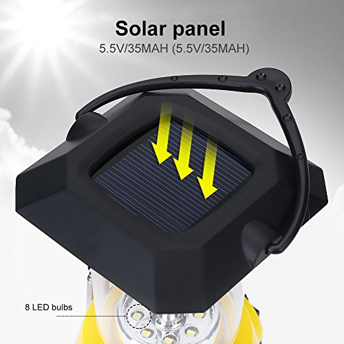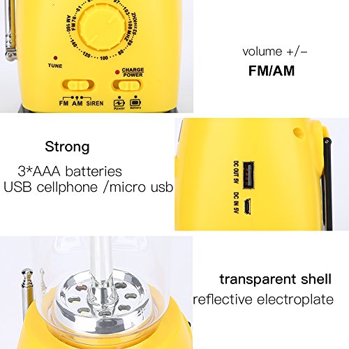 Diese Camping verfügt über 8 LED-Laterne für eine helle Ausleuchtung. Sie enthält UKW / MW für Ihre Lieblingsprogramme. Mit dem Solarpanel und der Handkurbel können Sie Strom für Mobiltelefone oder andere USB-kompatible tragbare Geräte erzeugen.