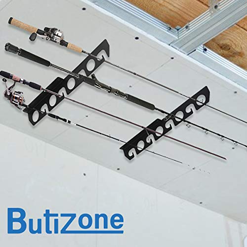 Platzsparendes 2-in-1-Gestell kann an Wand oder Decke montiert werden, um Ihre Angelruten zu verstauen. Ideal Anstatt die Aufbewahrung von Angelruten, Wanderstöcken, Skistöcken, Hockeyschlägern des Weiteren Queues des Weiteren mehr.