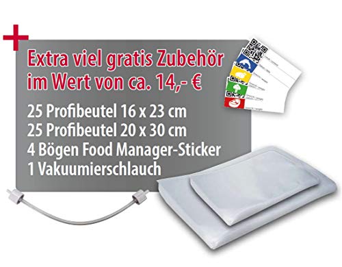 Alleinig massenhaft gratis Zubehör: 25 Profibeutel 16×23 cm, 25 Profibeutel 20×30 cm, 4 Bögen Food Manager-Sticker, 1 Vakuumschlauch für Behälter
