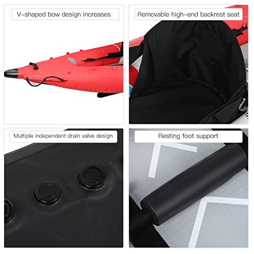 【Ausgezeichnetes Comfot】 Das aufblasbare Kajak verwendet einen abnehmbaren Sitz mit hoher Rückenlehne und mehreren Taschen, der mit einem hochwertigen Schaumstoffkissen ausgestattet ist und hervorragenden Komfort und Rückenstütze bietet.