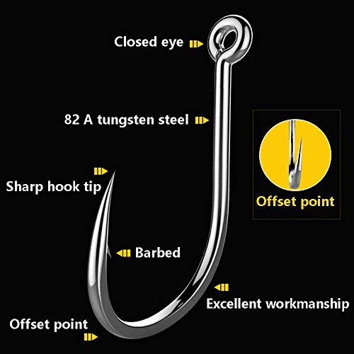【Perfektes Design】: Offset-Park, extrem scharf, spezieller Stachel, um sicherzustellen, dass der Hakenpunkt in der Ecke des Fischmunds rollt und die Fische Sterblichkeit senkt.