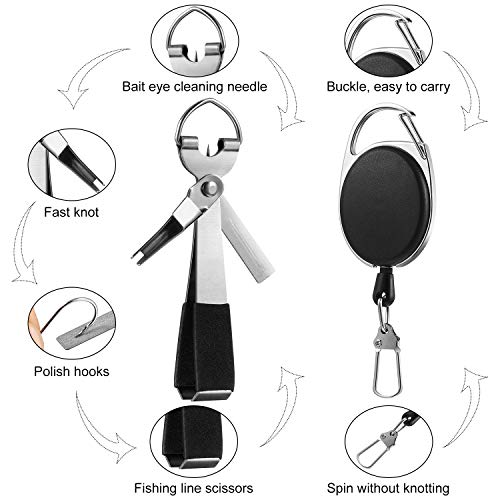 Multifunktionales Design: Mono-Schnurknipser kann schnell die Angelschnur knoten, der Schwanz ist mit einem Nagelknipser entworfen, um überschüssige Schnur zu absicheln, halten Sie Haken mit Hakenfeile, ausgestattet mit Ring zum einfachen Tragen, binden Sie Ihre gesamte Fliegenschnur mit diesem Werkzeug, reinigen Sie Ihre Augenlöcher mit der eingebauten Nadel. Gute Angleichung für Ihr Angelzubehör