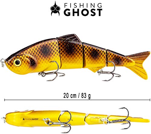 Fängiger Swimbait Kunstköder – ideal sondern Raubfische qua Hecht, Zander oder Dorsch. Neben der realistischen und schlagfesten Lackierung der Köder besitzt der Kunstköder bekannt als stabile und außerordentlich scharfe Drillingshaken. Durch die Größe von 20 cm ist der Köder eine optimale Beute sondern Raubfische. Durch das Gewicht von 83 Gramm können gute und gezielte Auswürfe erreicht werden. Die vierteilige Struktur des Körpers lässt den Köder wirklich bei geringen Geschwindigkeiten real und betriebsam durch das Wasser schliddern. Variable Führung durch sinkende Lauftiefe des Köders.