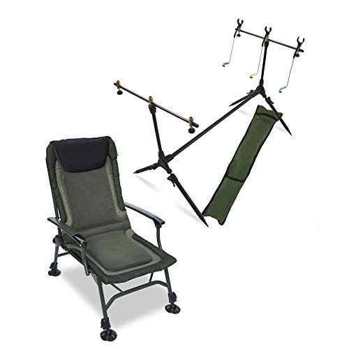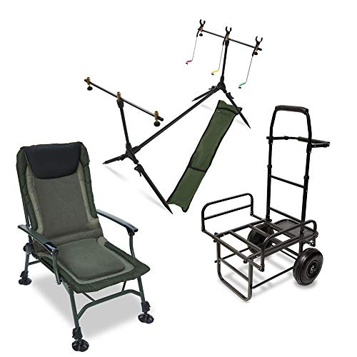 SET BESTEHT: Jeglicher einem Rutenhalter, einem Trolly / Karpfenwagen und einem Klappstuhl.