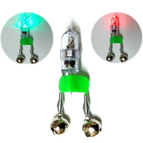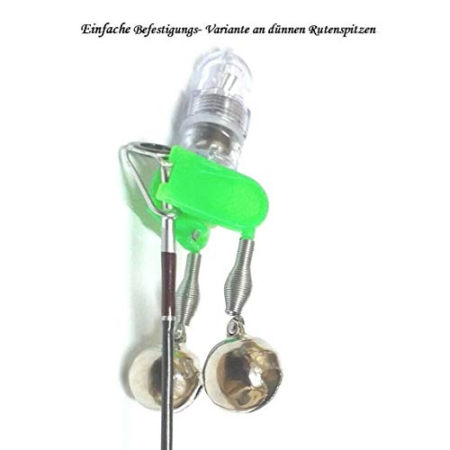 Im Gegensatz zu herkömmlichen Glocken wird diese Zwei-Schellen-LED- Aalglocke bei einem Biss mit 2 LED Leuten sehr hell rot und grün beleuchtet welches dann, auch noch ca. 10 Sekunden nachleuchtet / Dieses hat den riesengroßen Vorteil das Sie auch nicht direkt gesehene Bisse (wenn Sie sich z.B. hinwieder einmal von den Ruten entfernt bzw. unauffindbar gedreht haben) noch im nach hinein gut sowie gefestigt zuordnen können