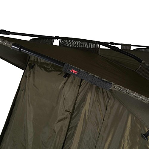 Das raumeffiziente JRC Defender Peak Bivy 2 Man Zelt umfasst ein Vordach sowie Moskitonetze vorne des Weiteren achteraus.