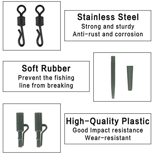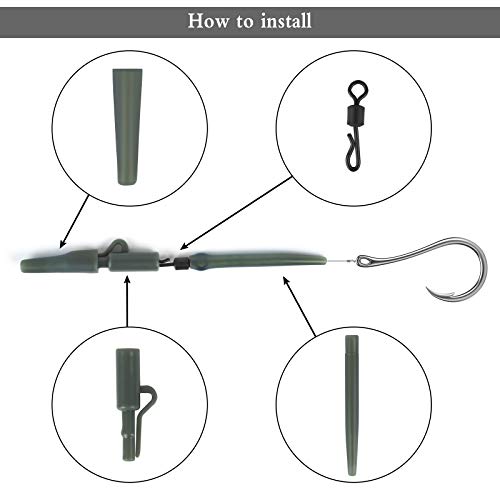 Einfach zu bedienen: Karpfen Angelzubehör ist klein und bequem. Sie können es einfach und anpassbar verwenden. Suffigieren Sie einfach die Wechselwirbel in der Mitte der Angelschnur an, installieren Sie die Schwanzgummis und Anti Tangle Hülsen l an der Schnur und Suffigieren Sie den Kunststoff-Blei-Clips an.
