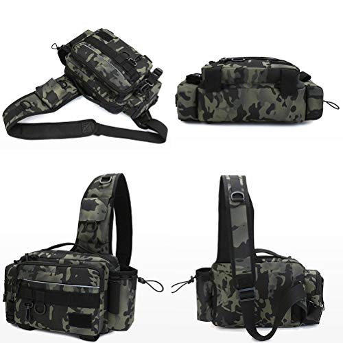 Die Angeltasche ist mit mehreren Taschen ausgestattet, um Ihnen ein komfortables Angeln zu anbieten. Der Schultergurt kann von 110 bis 140 cm verlängert werden, und der Hüftgurt kann auf 56 bis 110 cm eingestellt werden.