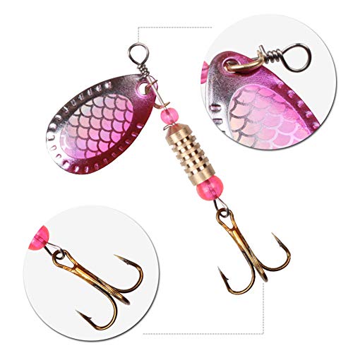 [Premium-Materialien] Alle Spinner kommt mit einem maschinell bearbeiteten Messing scharfen Drillingshaken, plattiertem Hauptkörper und Edelstahlspindel. Mit bunten Strike-Attractor Sleeves bieten diese Angelköder kontinuierlichen Blitz und Vibration.