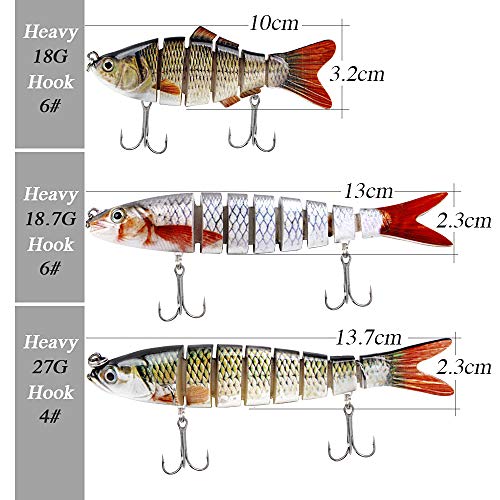 Länge und Gewicht: 1pcs x 6 teiliger Köder (10cm/18g mit 6# Haken), 1pcs x 8 teilige Köder (13cm/18.7g mit 6# Haken) und 1pcs x 8 teiliger Köder (13.7cm/27g mit 4# Haken).