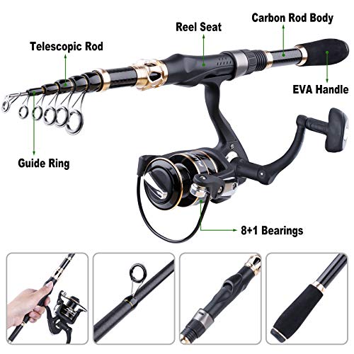 【Angelset mit Bester Wert】 – Es handelt sich um eine All-in-One-Angelset mit Tragtasche und notiwendigem Angelzubehör. Es wird mit einer Teleskop-Angelrute aus Kohlefaser, einer Spinnrolle, einer Angelschnur, einem Angelgerät und einer Reisetasche geliefert.