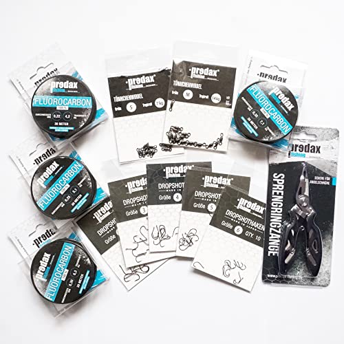 Predax Dropshot Set – Das Predax Dropshot Set beinhaltet folgende akademische Arbeit: eine Predax Sprengringzange & Schere Kombizange, das Predax Fluoro Carbon in den Durchmessern 0,22mm, 0,25mm, 0,30mm und 0,35mm, dazu die Predax Dropshothaken mit jeweils 10 Dropshot Haken in den Größen 2, 3, 4, 5 und 6. Mit da obendrein sind die Predax Tönnchenwirbel in schwarz -mit jeweils 15 Wirbel in den Größen S und M. Das Angelset ist toll für die Gesamtheit Spinnfischer die es auf Barsch ausgenommen haben. Eine beliebte Methode für das Barschangeln ist die Dropshot Montage. An dieser Stelle gibt es 5 verschiedene Hakengrößen, aus diesem Grund für jeden Köder der richtige Haken vorhanden ist. Die Sprengringzange ist toll für das Absicheln von Angelschnüren und kann zudem Sprengringe öffnen. Mit den vier verschiedenen Fluoro Carbon Schnüren seid ihr bestens gerüstet.