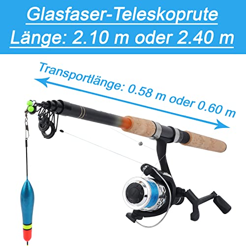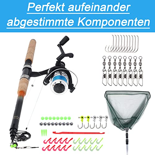 🐟 Angelset Combo: Teleskop Rute (210 cm), Kescher (160 cm), Angelrolle, Angelschnur (220 m), Tasche, Zubehörbox, Jigköpfe (5 St) Gummiköder (2 x 10 St), Hakenlöser, Pose 4g, Schrotblei 1g (10 St), Schnurstopper (3 St), Laufperlen (10 St), Angelhaken Gr. 6 (10 St), Wirbel Gr. 6 (10 St)