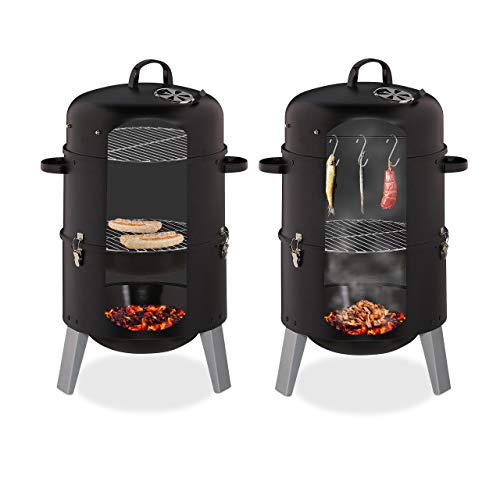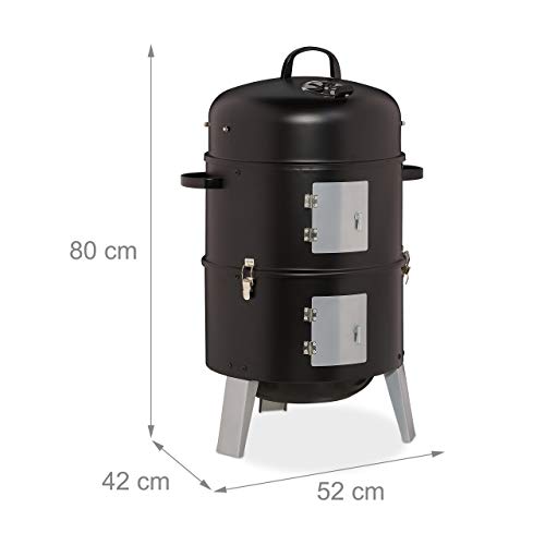 Relaxdays Smoker 3in1, zum Grillen, Räuchern & Garen, Thermometer & Luftabzug, BBQ Räuchertonne: ∅ 40 cm, Stahl, schwarz
