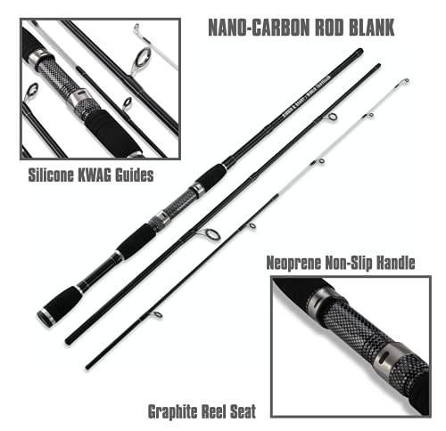 Sechs Abschnitte:Sehr stabile, aber leichte 6-teilige Angelrute mit einer Gesamtlänge von 205 cm, mit hochwertigen Ringen, 5 Nanokarbon-Abschnitte und 1 Endstück aus massiver Glasfaser für höchste Haltbarkeit.
