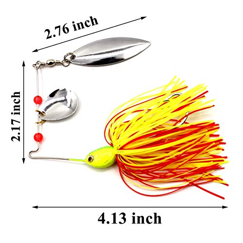 Dieser Spinnerbait hat Metalllöffel, einen mehrfarbigen Körper und Neonschwanzfedern. Ein großartiger Alleskönner, der alle Arten von Fisch anzieht.
