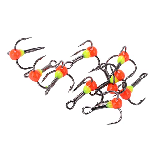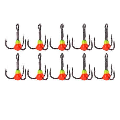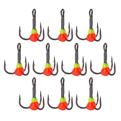 Hakenspezifikationen: Drillingshaken der Größe 10, via 20 mm / 0,8 Preis Länge, 16 mm / 0,6 Preis Breite und 7 mm / 0,3 Preis Hakenbreite.