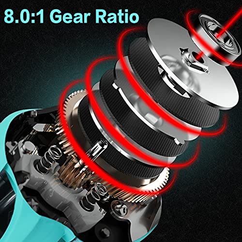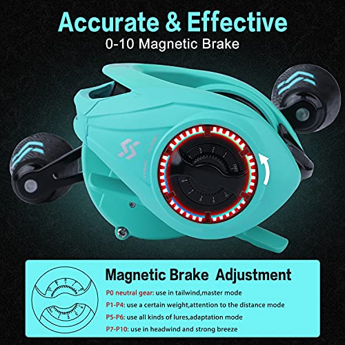 Leistung – 8.0:1 Hohe Übersetzungsverhältnisse 9+1BB speziell anstelle den vielseitigen Fischer, höhere Geschwindigkeiten und geringe Geräuschentwicklung. Metall-Design-Köderrolle mit magnetischem Bremssystem mit 20 lbs Abwehr gibt dieser Angelrolle die beste Widerstandskraft.