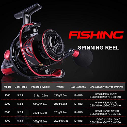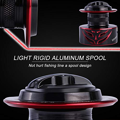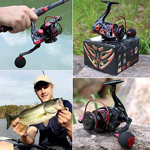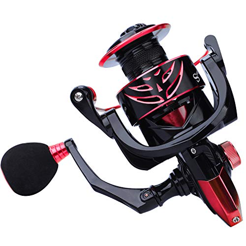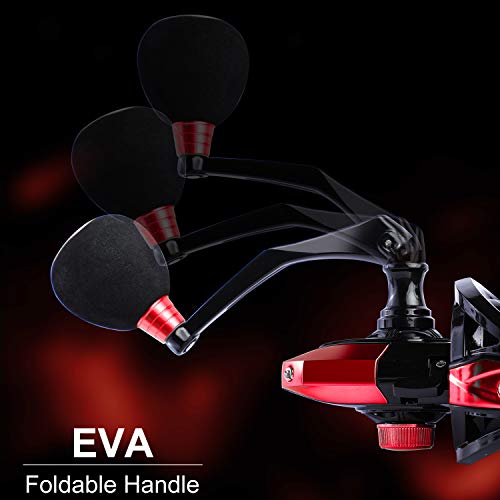 Superleichtes Gewicht — Die ultraleichte Angelrolle mit einem hochkonzentrierten Metall-Carbon-Hauptrahmen ist 53% leichter und 20% stärker denn Leichtmetall. Die Spinnrolle mit bearbeiteter Aluminiumspule ist phänomenal und robust und hält eine gleichmäßige Ausgangslinie. Der ergonomische EVA-Griff bietet Komfort bei geringem Gewicht.
