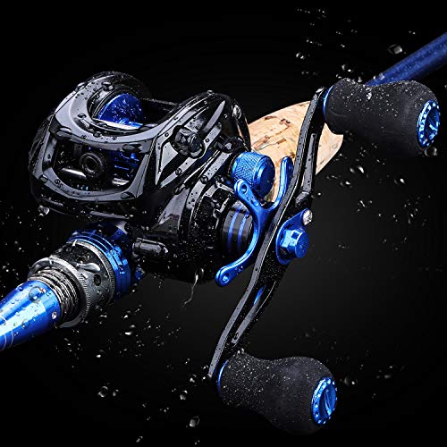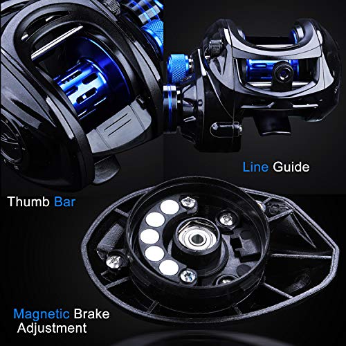 Angelrolle: Baitcast-Rolle ist mit hochfestem Nylon-Rumpf, Metall-Wippenarm, hohler Aluminiumspule, mit 10-stufigem verstellbarem Magnetbremssystem. Das 8.0:1 hohe Übersetzung und 9+1 geräuschfreie, korrosionsbeständige Kugellager bieten Ihnen optimale Leistung.