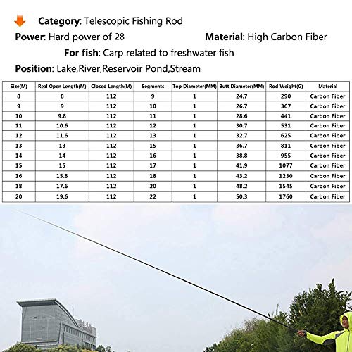 Angelrutengröße: 8 m, 9 m, 10 m, 11 m, 12 m, 13 m, 14 m, 15 m, 16 m, 17 m, 18 m, 20 m.Geschlossene Länge: 112cm.