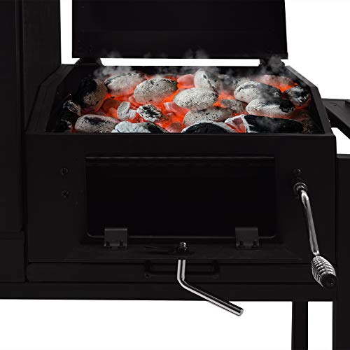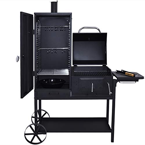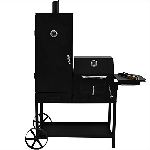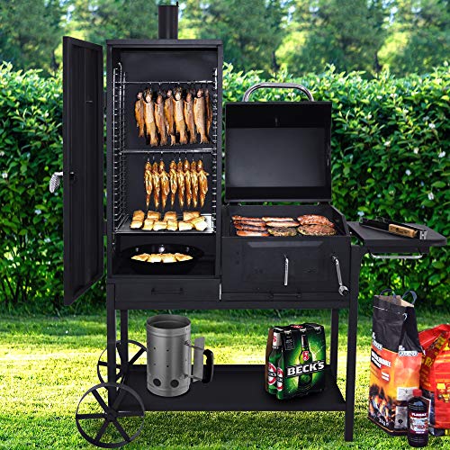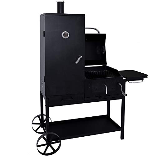 BBQ Grill – Smoker Bovini 2 Barbecue ist eine Hommage an den Grillfreund, der neben dem BBQ räuchern und einen flexiblen Grillwagen nutzen möchte. Das Multitalent Ganz dem Hause Syntrox Germany verbindet die Vorteile eines BBQ Grills mit einem Räucherofen, einem Holzkohlegrill und Grillwagen in einem Triebwerk. Das robuste Gestell Ganz Rundrohr verfügt über zwei Stangenfüße und zwei große Räder Ganz massivem Stahl. Möchten Sie Ihren Smoker Bovini bewegen, heben Sie ihn an einer Seite an und rollen ihn an den gewünschten Standort. Die mattschwarzen Oberflächen verleihen dem Smoker eine edle und hochwertige Ausstrahlung, die er im Einsatz unter Beweis stellt und mit leckerem Grillgut oder frischem Räucherfisch untermauert. Das BBQ wird mit dem Smoker Bovini zu einem Erlebnis, das im Überfluss Diversität auf den Speiseplan und unterschiedliche Möglichkeiten zur Zubereitung auf die Tagesprogramm setzt. Mit diesem Smoker können Sie Fisch selbst räuchern und Schinken herstellen, grillen und den Stellplatz selbst eingrenzen.