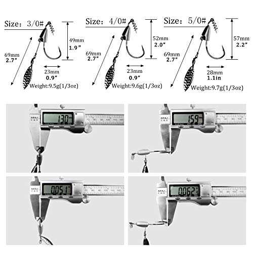 WIRKSAM & EINFACH ZU VERWENDEN : Swimbait Hooks sind effektiv und einfach zu bedienen. Die Blattspreite ist am Draht befestigt und mit einem Kugellager drehbar gelagert. Es gibt 3 Größen: 3/0 (Hakenlänge 49 mm), 4/0 (Hakenlänge 52 mm), 5/0 (Hakenlänge) 2,2 in / 57 mm). Gewicht: 1 / 3oz. Länge der SPINNKLINGE: 69 mm. BITTE BEACHTEN SIE, dass die weichen Angelköder wohl als Referenz dienen und nicht im Lieferumfang enthalten sind.