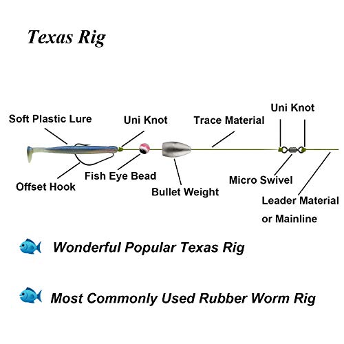 🐟FÜR POPULAR TEXAS RIG: Der Texas Rig ist bei weitem die am häufigsten verwendete Gummischneckenanlage. Es wird hauptsächlich für seine unkrautlosen Eigenschaften verwendet und gibt dem Wurm ein schönes und gerade Profil. Traditionell ist ein Texas Rig gewichtet. Obwohl viele Angler ihre Würmer im „Texas Style“ ohne Gewicht aufbessern, während sie die unkrautlose grafische Darstellung des Riggs verwenden. Arbeitet besser, wenn Sie auf Fische zielen, die sich gerne in dicken Deckungen verstecken.