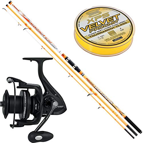 Trabucco KRONOS CAST MASTER MN 420 Eigenschaften Carbon Struktur S.H.M.R. Hochfester Schaft mit hoher Reaktionsfähigkeit für lange, präzise Würfe (Fast Reaction Finanzschwach) Gelenke verstärkt durch gekreuzte Bänder aus Carbon (Cross Reinforce) Vetta Rohr (TB), extrem empfindlich und leistungsstark Ausrichtungslinien für eine perfekte Montage der Abschnitte S-SiC-Ringe mit doppeltem Schaft, leicht und salzfest DPS Rollenhalterung aus behandeltem Stahl mit Korrosionsschutz hinab. Rutschfestes Material für eine sehr gute Griff beim Werfen + Angelrolle 9000 QOSMIO XT Power Game Ancor vor dem Drehen vermittelt bereits ein Affekt von Festigkeit und Kraft, mit den nötigen Zutrauen, um schwere Tätig sein zu bewältigen, vom Boot und aka an den Rändern von Flüssen zu bewältigen. Der gehärtete Graphitkörper beherbergt die Endlosschraube, die für die perfekte Abfolge der Angelschnur verantwortlich ist. Die robuste Aluminiumspule hat eine enorme Kapazität mit der extrem dünnen Oberkante um minimalen Schläge an der Ausgangsschnur zu entgegenzuwirken, während die Kupplung überdimensionierter Scheiben eine spürbare Leistung entfaltet. Die Kurbel ist lang, um einen konsistenten Hebel zu bieten, während sie gebogen ist, um Ihren Schwerpunkt näher an den Körper zu bringen, wodurch die Schwingungen bei der Erholung reduziert werden. Der Gummiknopf hat ein asymmetrisches Design, um sicherzustellen, dass Sie aka bei anspruchsvollen Kämpfen stabil sind. + Velvet XPS ProCast 300 m Spezifisches Surfcasting-Kabel für Wettkämpfe, hergestellt in einer sehr intensiven warmen gelben Farbe, die besonders sichtbar bei Tag und Nacht ist, wenn die Taschenlampe beleuchtet wird, ermöglicht es Ihnen, sofort die tatsächliche Richtung Ihrer Angelschnur zu identifizieren. Superweich, silikonisiert und ohne mechanischen Speicher, kommt mühelos aus der Rolle heraus und garantiert Ihnen automatisch längere Würfe.