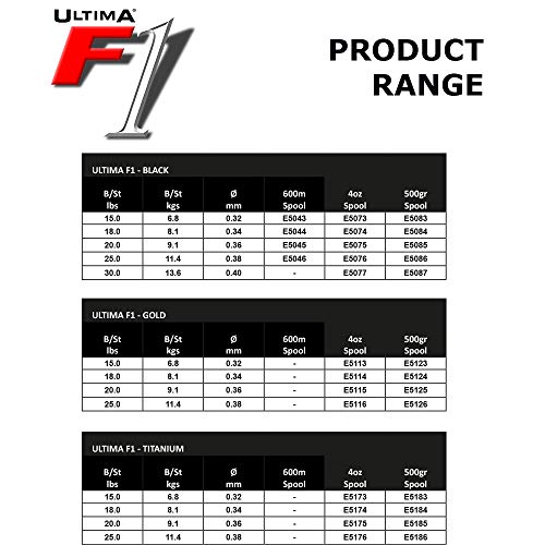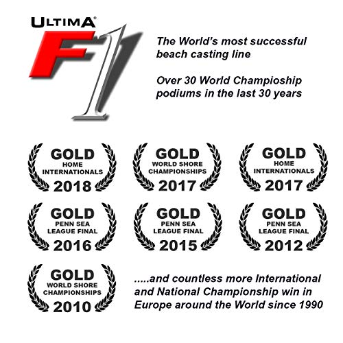 Ultima F1 ist bei vielen internationalen Anglern seit Jahren die erste Kür. Dieses Hochleistungs-Produkt wurde unter Verwendung der hochwertigsten Materialien hergestellt, das die perfekte Balance einer Wettkampfschnur, und einer Schnur für das schwere Brandungsangeln garantiert. Hohe lineare Tragkraft und Knotenfestigkeit, kombiniert mit einem weichen und geschmeidigen alphabetisches Zeichen, um weiter und genauer zu werfen. Ultima F1 is Mit Herz und Seele abriebfest und handkehrum äußerst geschmeidig. In den letzten zwanzig Jahren hat Ultima mit der F1 mehr Meisterschaften gewonnen, wie allesamt andere Hersteller. Ein Beweis dafür als aussergewöhnlich diese Schnur ist.