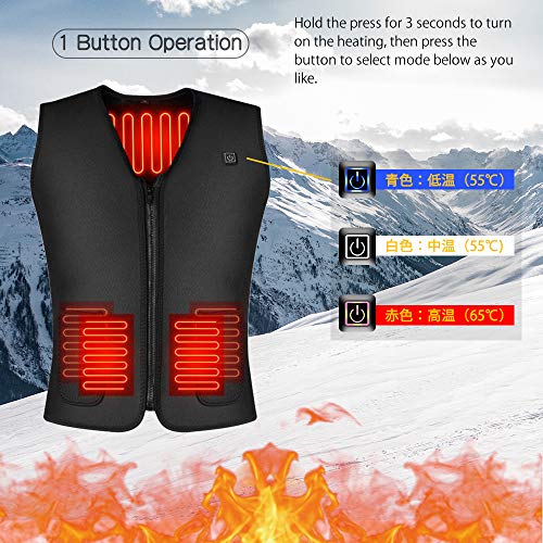 [3 Heizstufen & USB-Anschluss ] Heizweste hat einen Drei-Gang-Smart-Thermostat, nämlich starke 65 ° C (rot), mittlere 55 ° C (weiß) und schwache 45 ° C (blau). Der USB-Stecker ist mit den meisten mobilen Netzteilen auf dem Marktgebiet kompatibel und die Ausgangsleistung beträgt 5 V / 2,1 A. Beheizte Ablaufzeit bis zu 6-10 Stunden je nach Power Bank / eingestellter Temperatur (ohne Akku)