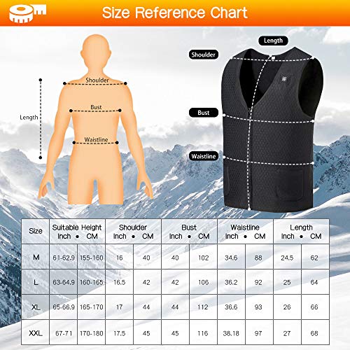 [3 Heizstufen & USB-Anschluss ] Heizweste hat einen Drei-Gang-Smart-Thermostat, nämlich starke 65 ° C (rot), mittlere 55 ° C (weiß) und schwache 45 ° C (blau). Der USB-Stecker ist mit den meisten mobilen Netzteilen auf dem Markt kompatibel und die Ausgangsleistung beträgt 5 V / 2,1 A. Beheizte Laufzeit bis zu 6-10 Stunden je nach Power Bank / eingestellter Temperatur (ohne Akku)