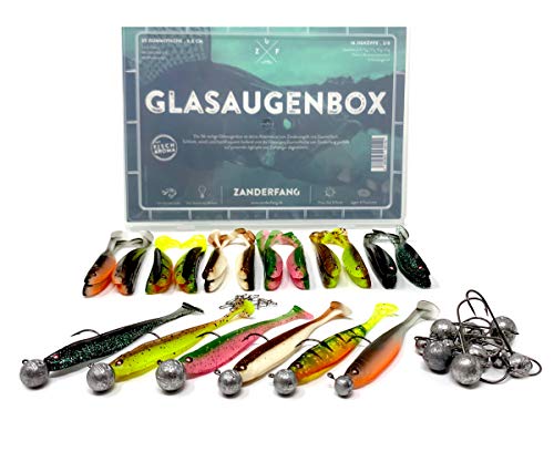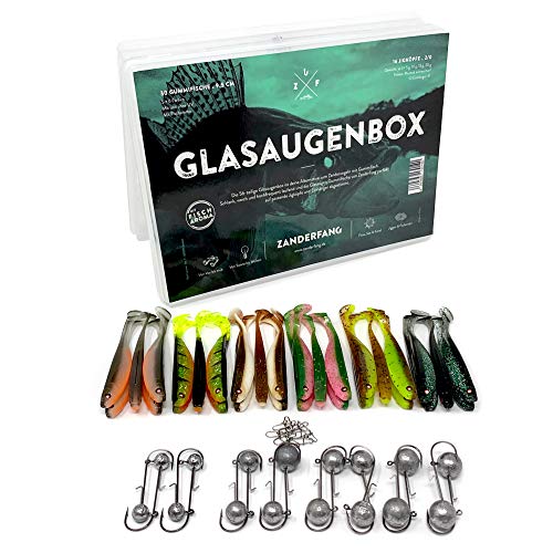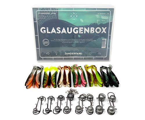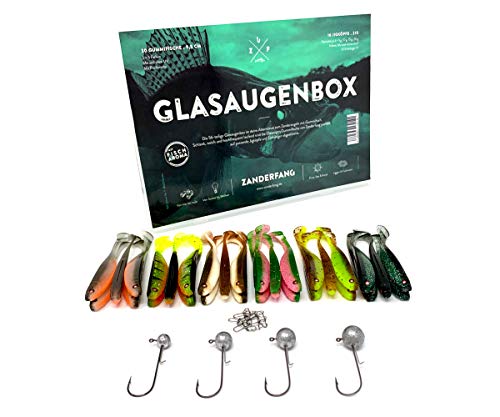 Die GLASAUGEN Gummifisch Box von ZANDERFANG ist zum gezielten Zanderangeln mit Gummifisch entwickelt. Mit dieser Köderbox bist du bei jedem Wetter und Wasser perfekt zum Zanderangeln ausgestattet. Sechs verschiedene Farben an Gummifischen und vier verschiedene Gewichte an Jigköpfen. Die GLASAUGEN Gummifische sind an Unterleib und Rücken leicht geschlitzt. So kannst du die Gummifische vulgo am Offsethaken fischen und auf jede Angelsituation perfekt reagieren.