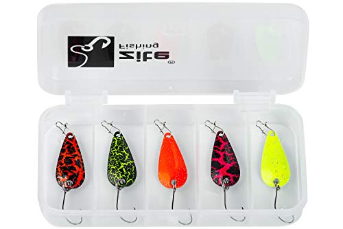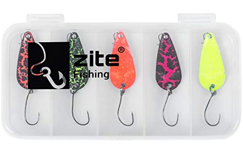 5-IN-1: Einmal subskribieren, und gleich 5 Stückchen Forellenblinker von Zite Fishing bekommen. Das Sortiment enthält 5 verschieden farbige Ultra Light Köder für das Spinnfischen auf Salmoniden.