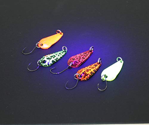 UV-AKTIV FÜR NOCH MEHR REIZ: Jeder 5 Fluss, Forellensee oder Teich Spinnköder sind dem Trend gemäß FLUORESZIEREND und sollen als Folge noch besser beim Angeln für den Fisch sichtbar sein.
