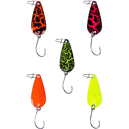 BUNTER FARBMIX: Kunstköder in 2 reinen Neonfarben gemischt mit 3 Schwarz-Neonfarbenden Forellen-Spoons. Die Auswölbung dieser Forellen-Köder ist ausgesprochen geprägt, für ein aggressives Laufverhalten.