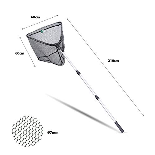 LEICHT UND HANDLICH: Der Angelkescher ist bis auf 2,10 m teleskopierbar und hat eine Bügellänge von 60 cm. Die Netztiefe beträgt ebenfalls 60 cm. Deswegen aka noch ideal denn Kinder-Kescher und Teich-Kescher sinnvoll.
